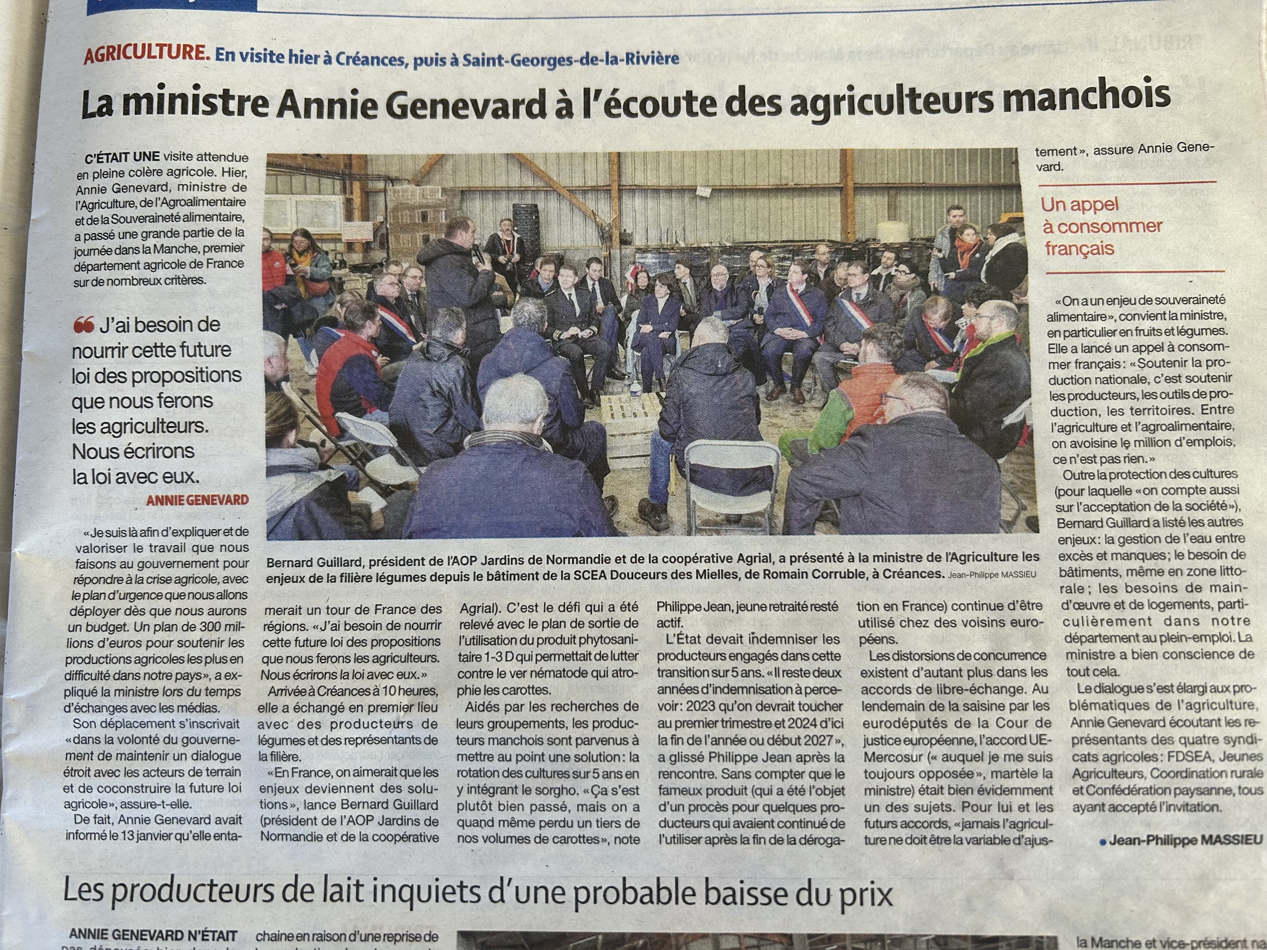 Lire ici l'article de presse de la manche sur la visite de la ministre de l'agriculture dans une ferme de la manche Lire en page lien les Articles de journaux sur Agrial et Terrena